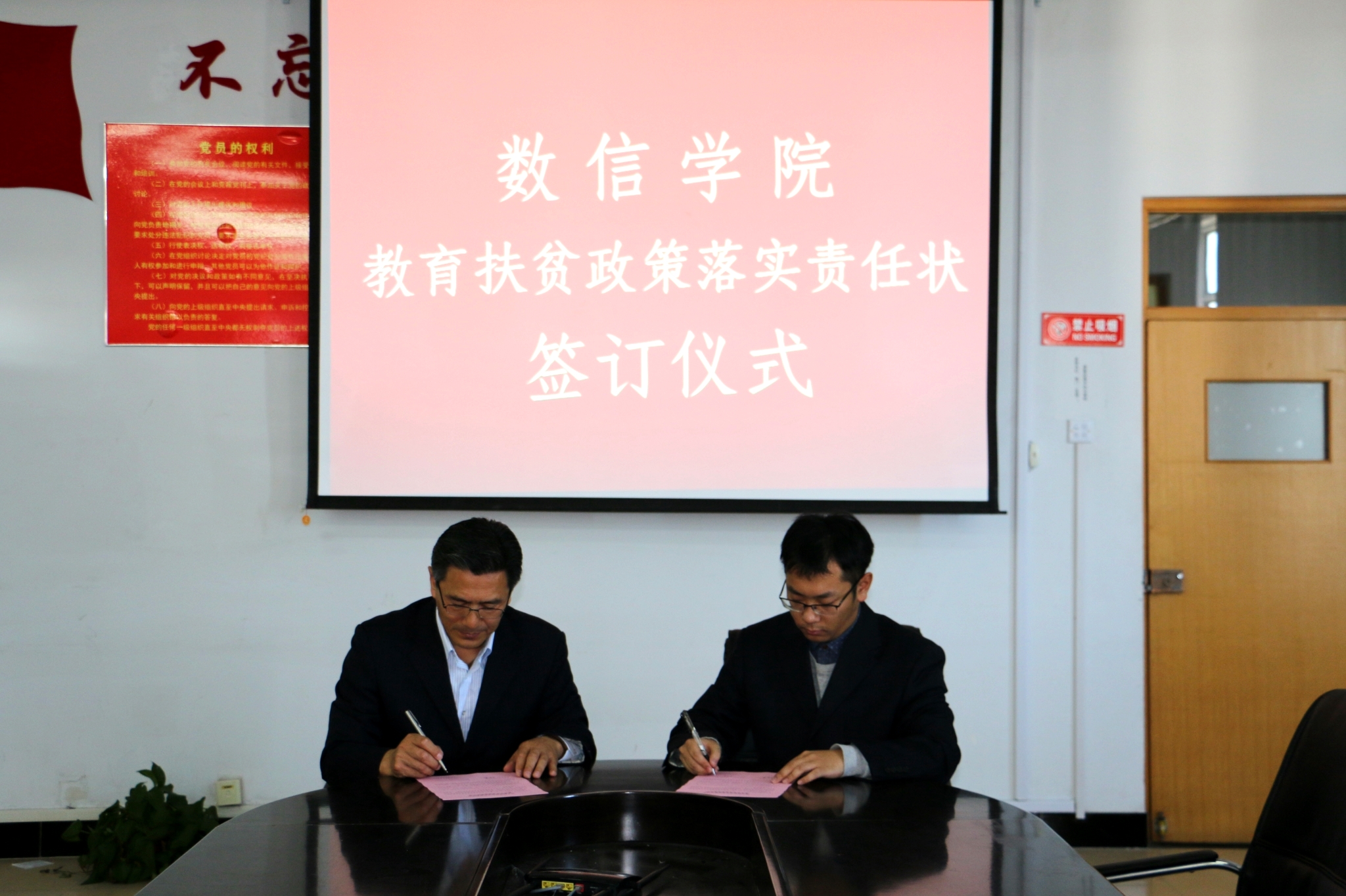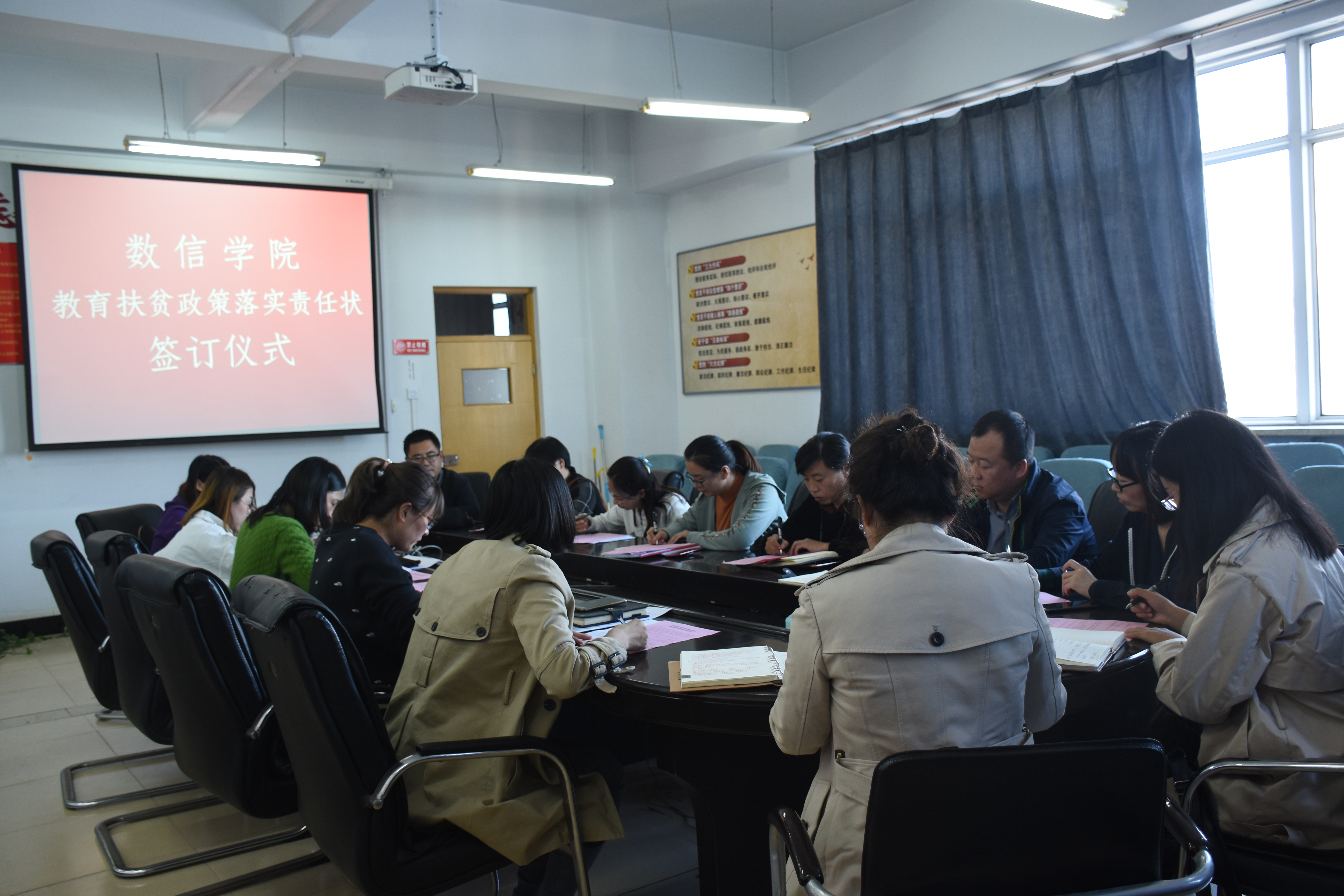 2018年10月11日下午,Playace平台官网入口在秦皇岛校区逸夫楼Playace平台官网入口1001会议室召开了全院各专业77个班级25名辅导员(班主任)参加的教育扶贫政策落实责任状签订仪式,组织与会辅导员(班主任)学习贯彻国家、省、公司教育扶贫有关政策文件和相关规定要求,对全院辅导员(班主任)工作提出了三点要求:一是要牢固树立“四个意识”、坚定“四个自信”,要不折不扣落实好中央和地方的教育扶贫政策,确保政策不走偏、不走样,帮助家庭经济困难员工顺利完成学业;二是在“三金”发放过程中不得有任何形式的截留、平分和挪用,杜绝一切严重影响教育扶贫事项发生;三是要教育引导受助贫困员工要勤俭节约,要把助学金用在保障基本正常学习生活急需上,禁止有铺张浪费、大吃大喝等行为。