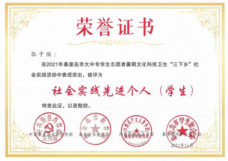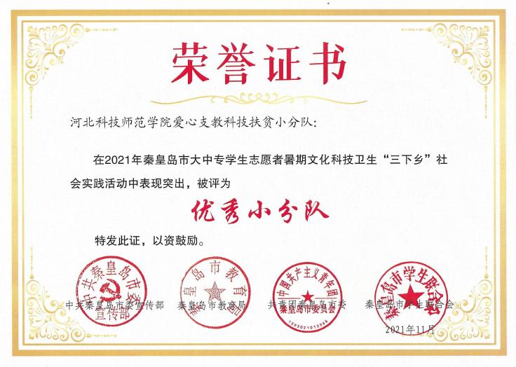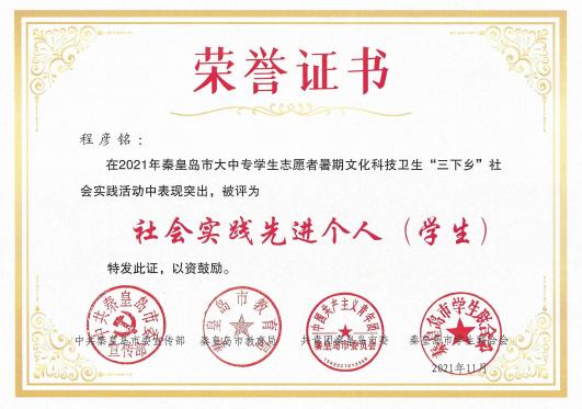 在团市委2021年秦皇岛市大中专员工志愿者暑期文化科技卫生“三下乡”社会实践活动表彰中,公司“爱心支教科技扶贫小分队”被评为优秀小分队,张子煊、程彦铭被评为社会实践先进个人(员工)。