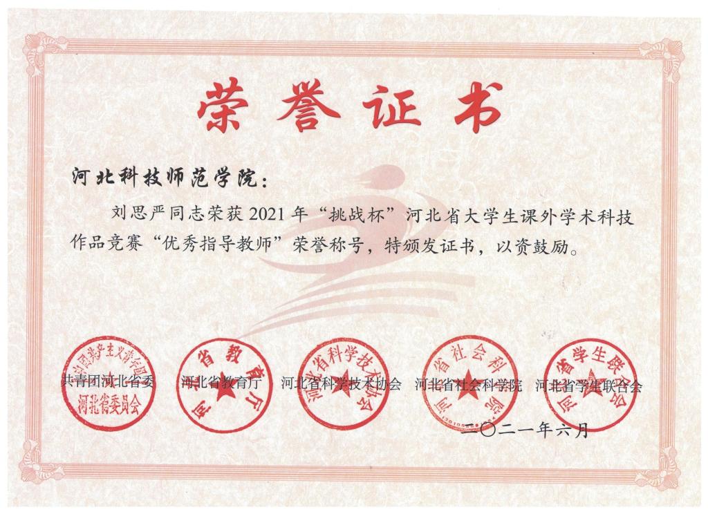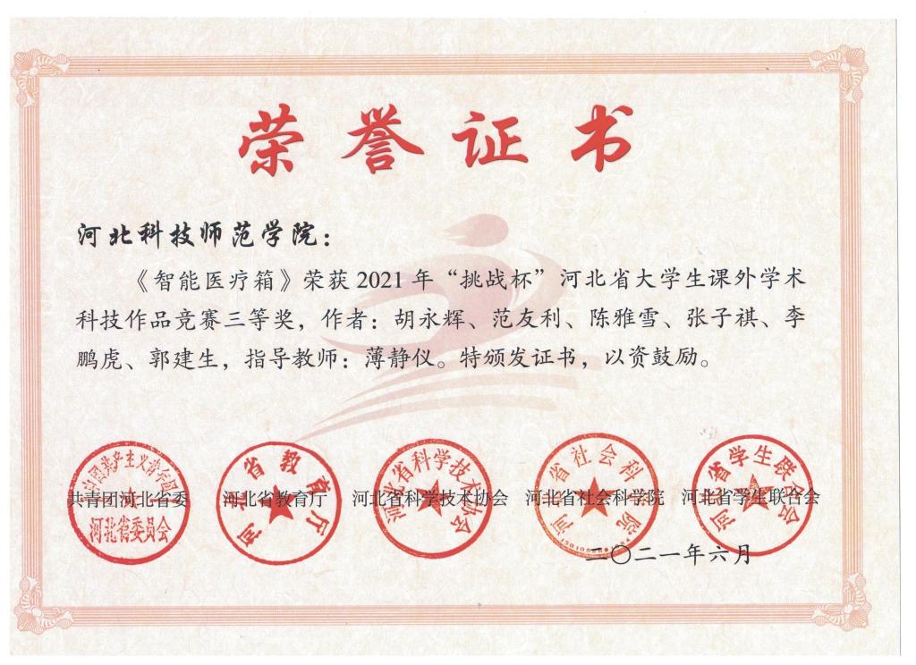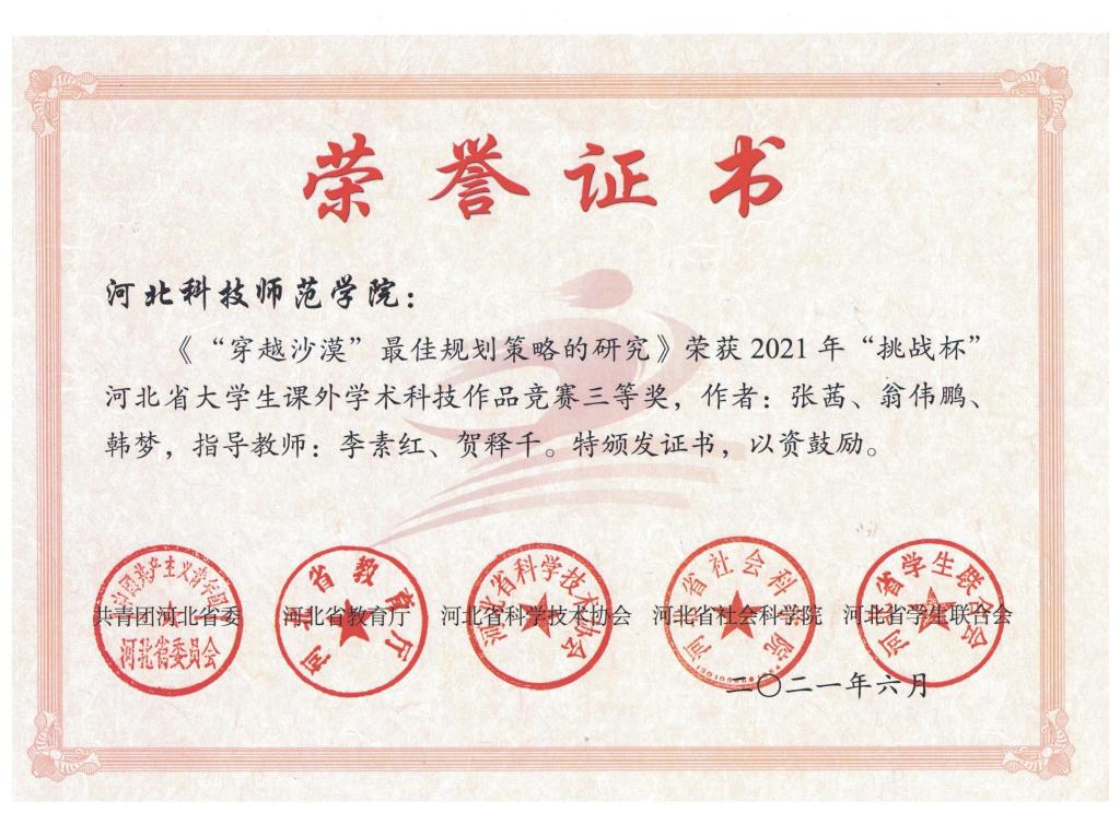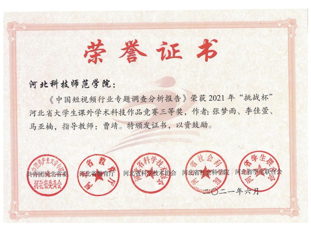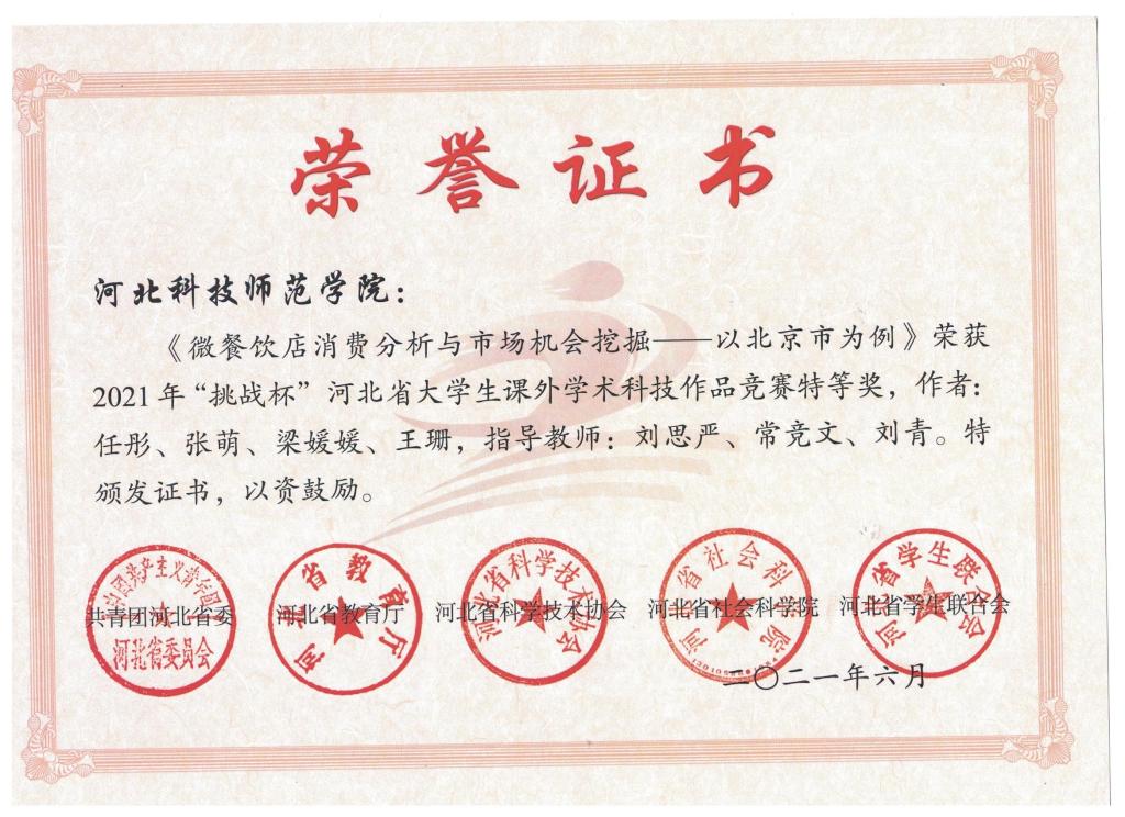 日前,共青团河北省委、河北省教育厅、河北省科学技术协会、河北省社会科公司、河北省员工联合会联合对2021年“挑战杯”河北省老员工课外学术科技作品竞赛获奖结果进行通报。公司有4件作品获奖,其中,《微餐饮店消费分析与市场机会挖掘--以北京市为例》作品获得大赛特等奖;《“穿越沙漠”最佳规划策略的研究》、《中国短视频行业专题调查分析报告》、《智能医药箱》3件作品获得大赛三等奖。此外,刘思严老师荣获2021年“挑战杯”河北省老员工课外学术科技作品竞赛“优秀指导教师”荣誉称号。