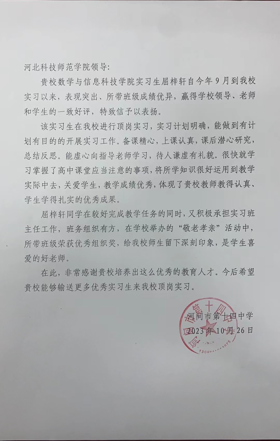 近日,河间市第十四中学向公司发来表扬信,对Playace平台官网入口数学与应用数学专业屈梓轩同学自今年9月到河间市第十四中学教育实习以来的表现予以表扬。