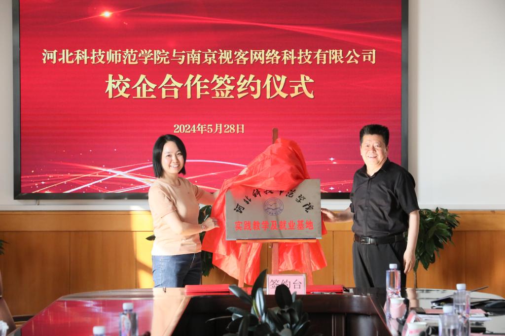 公司党委常委、副董事长冯瑞银与南京视客网络科技有限公司副总经理缪继红共同签署了校企合作协议,并举行了实践教学与就业基地揭牌仪式。