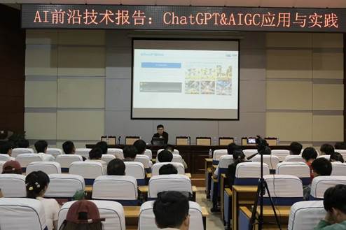 在前沿技术讲座活动中,公司聘请了企业讲师做关于ChatGpt与AIGC应用与实践的讲座。在ChatGPT及生成式人工智能AlGC爆发的时代,如何引导员工正确使用ChatGPT & AIGC技术,是公司产品中不可或缺的一环。在此次讲座过程中,周老师讲述了从ChatGPT到AIGC、大模型带来的行业影响、问答体验、ChatGPT的使用和调教以及AIGC应用等内容。讲座引起了同学对ChatGPT等人工智能技术的浓厚兴趣,激发同学们学习的热情。于张红老师为报告做了筹备工作。