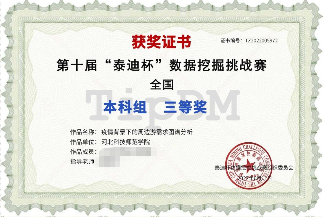 第十届“泰迪杯”数据挖掘挑战赛于2022年2月-7月举行,为激励应用统计学专业员工学习数据挖掘的积极性,以及分析、解决实际问题的综合能力,应统专业老师带领员工参加此项比赛,并取得2项国家级三等奖、1项省级二等奖、2项省级三等奖。